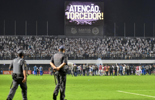 O motivo da possível interdição é a ‘guerra’ que aconteceu nesta quarta-feira (21), no clássico diante do Corinthians. O rival do Peixe vencia por 2 a 0, até que a torcida do Alvinegro Praiano começou a protestar contra o elenco, Odair Hellmann e o presidente Andres Rueda. Depois disso, bombas e sinalizadores foram arremessados ao gramado e polícia e torcedores entraram em confronto ao redor do estádio.