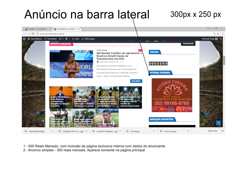 - Anúncio na lateral com 300px de largura x 200px e altura,