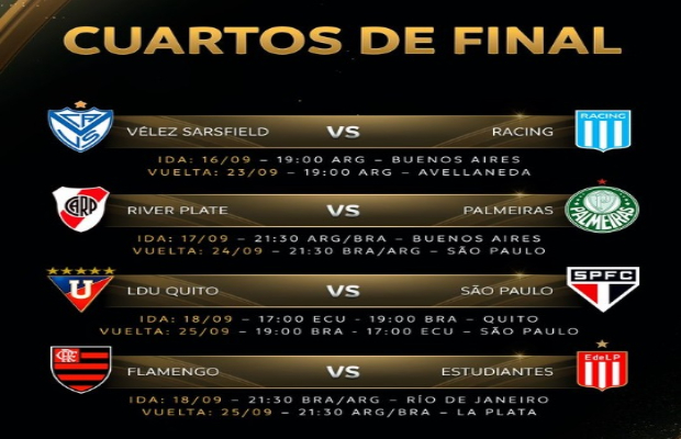 Confrontos acontecem entre 16 e 25 de setembro, com duelos de peso como River Plate x Palmeiras e Flamengo x Estudiantes